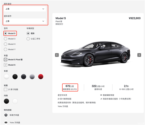 上海地区目前可选购Model S的Plaid版,售价为92.39万元,续航为672公里(CLTC工况),网站显示该车“即刻交付”。Model X同样暂无现车,可选购二手车。