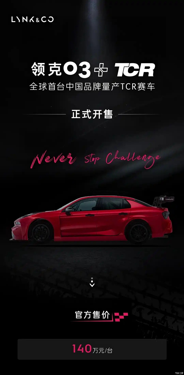 日前获悉,领克03+ TCR赛车正式上市,官方售价140万元。车辆为首台中国品牌量产的TCR赛车,提供350马力,峰值扭矩420牛·米,目标重量(含车手)1265kg。同时,新车还将提供冠军车手大师课、赛事无忧包、光影自传等购车权益。