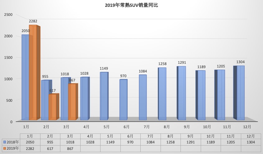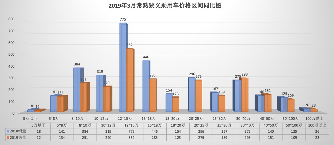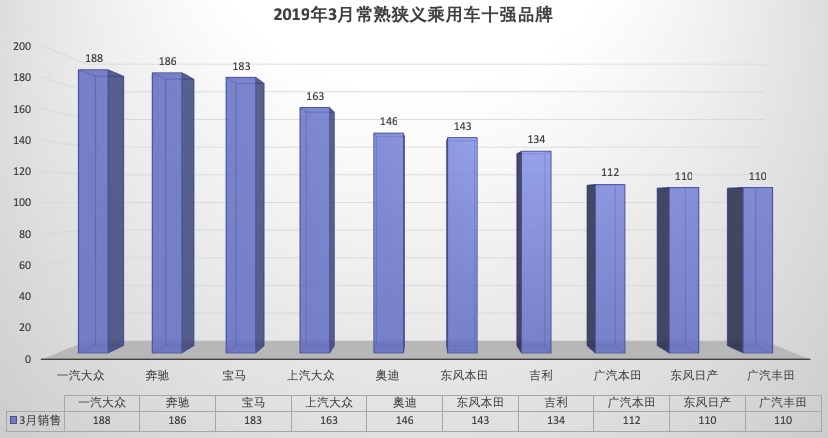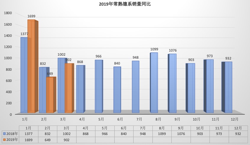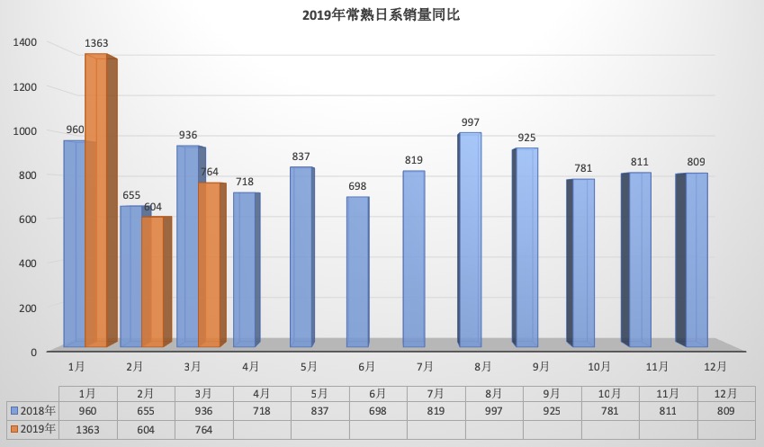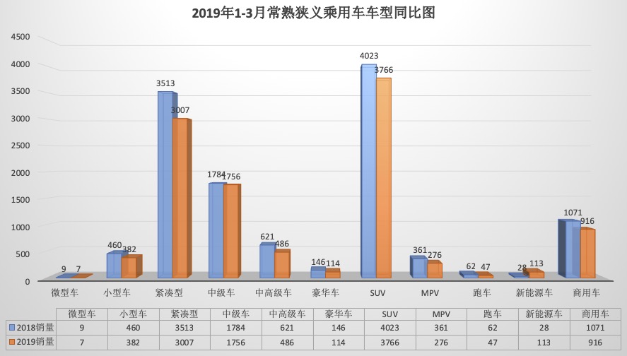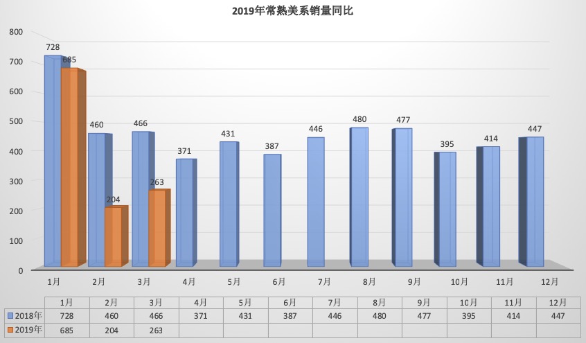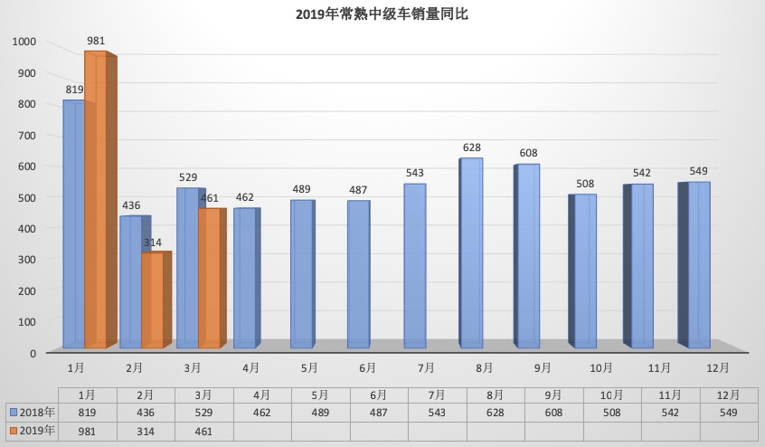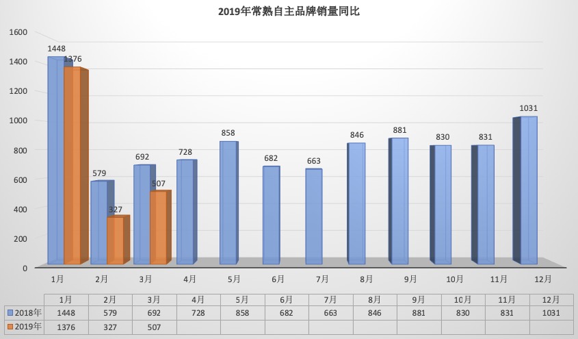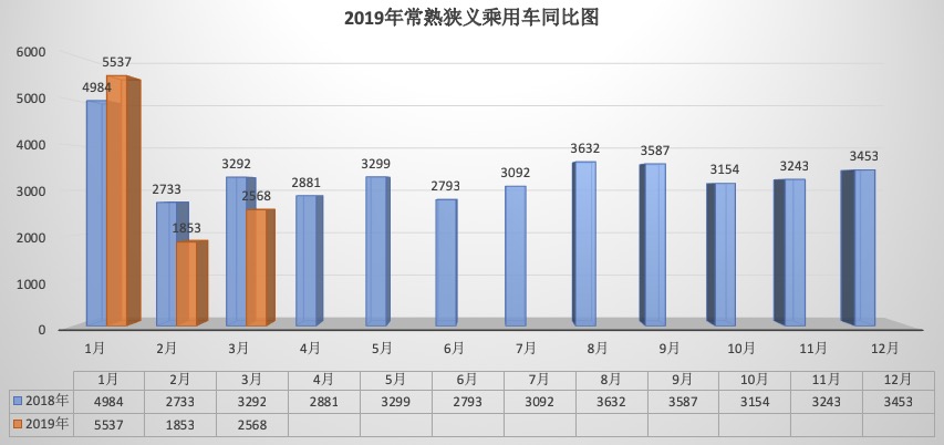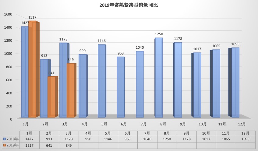 [常熟车城讯] 2019年3月常熟狭义乘用车销量2568台同比下滑21.99%,环比上涨38.59%。1-3月总销量同比下降9.55%。1-3月总销量中自主品牌同比下降18.72%,美系品牌同比下降30.35%,几乎接近谷底的韩系品牌同比下降21.77%,贴地飞行的欧系车同比下降41.13%几乎降无可降。德系逆势增长1.21%,日系以7.06%的增长领跑车市。春寒不定斑斑雨,宿醉难禁滟滟杯。春天不因为你我心情的郁抑而放缓脚步,清明时节明媚而灿烂的阳光遍洒,和车市一副无精打采的模样绝对是冰火两重天。