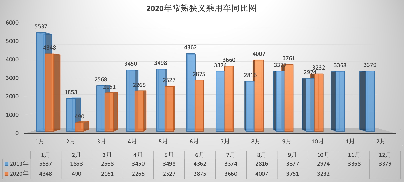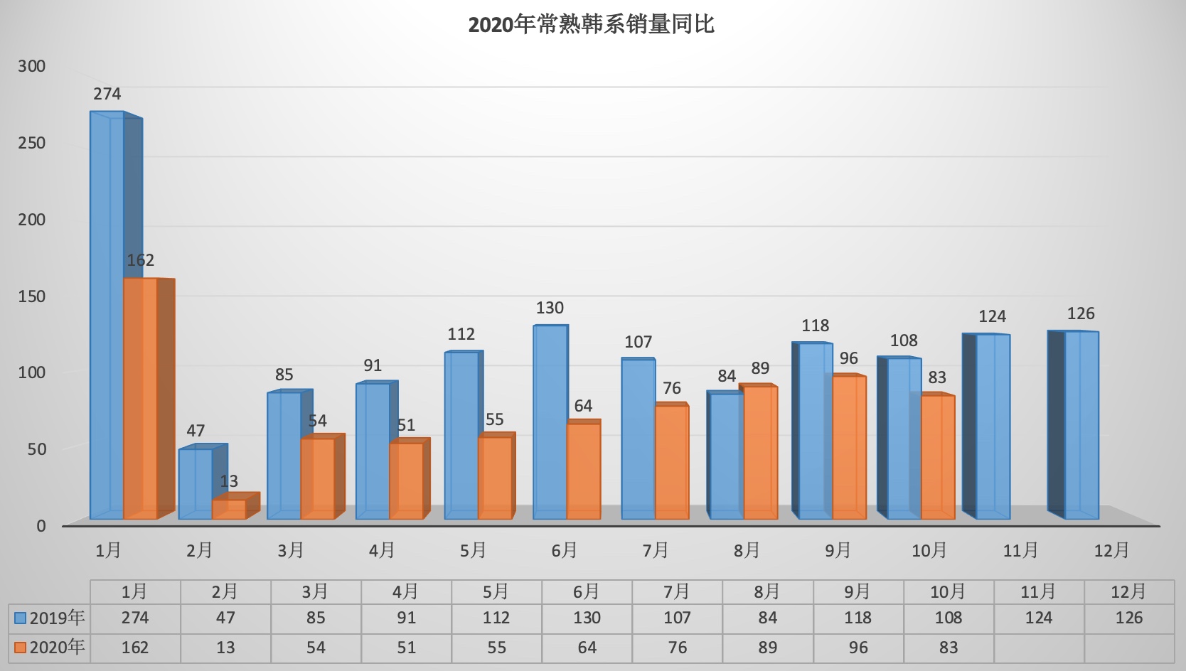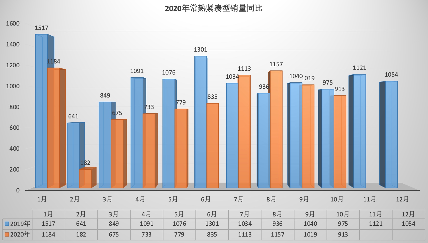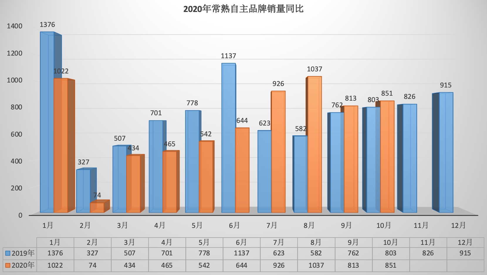 2020年10月常熟狭义乘用车销量3232台同比增长8.68%,环比下降14.07%。1-10月常熟狭义乘用车总销量29326台,同比下降13.26%。10月销量中自主品牌同比增长5.98%,美系品牌同比增长34.38%,韩系品牌同比下降23.15%,欧系车同比增长37.50%,德系同比增长1.20%,日系同比增长13.07%。