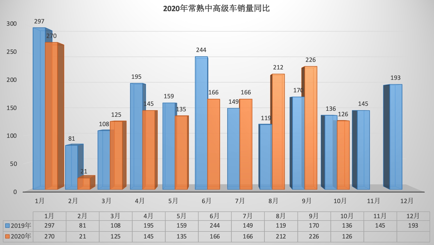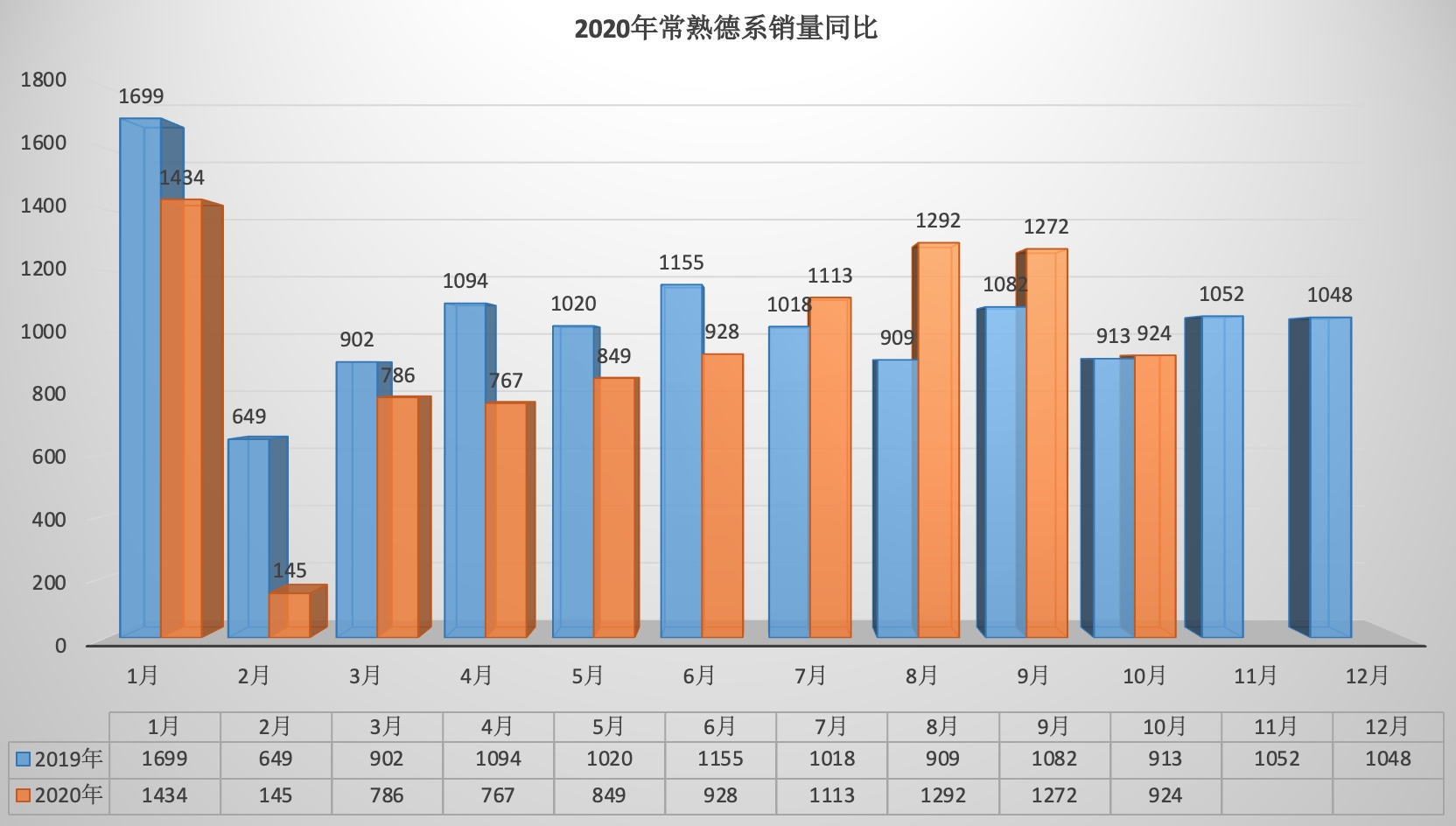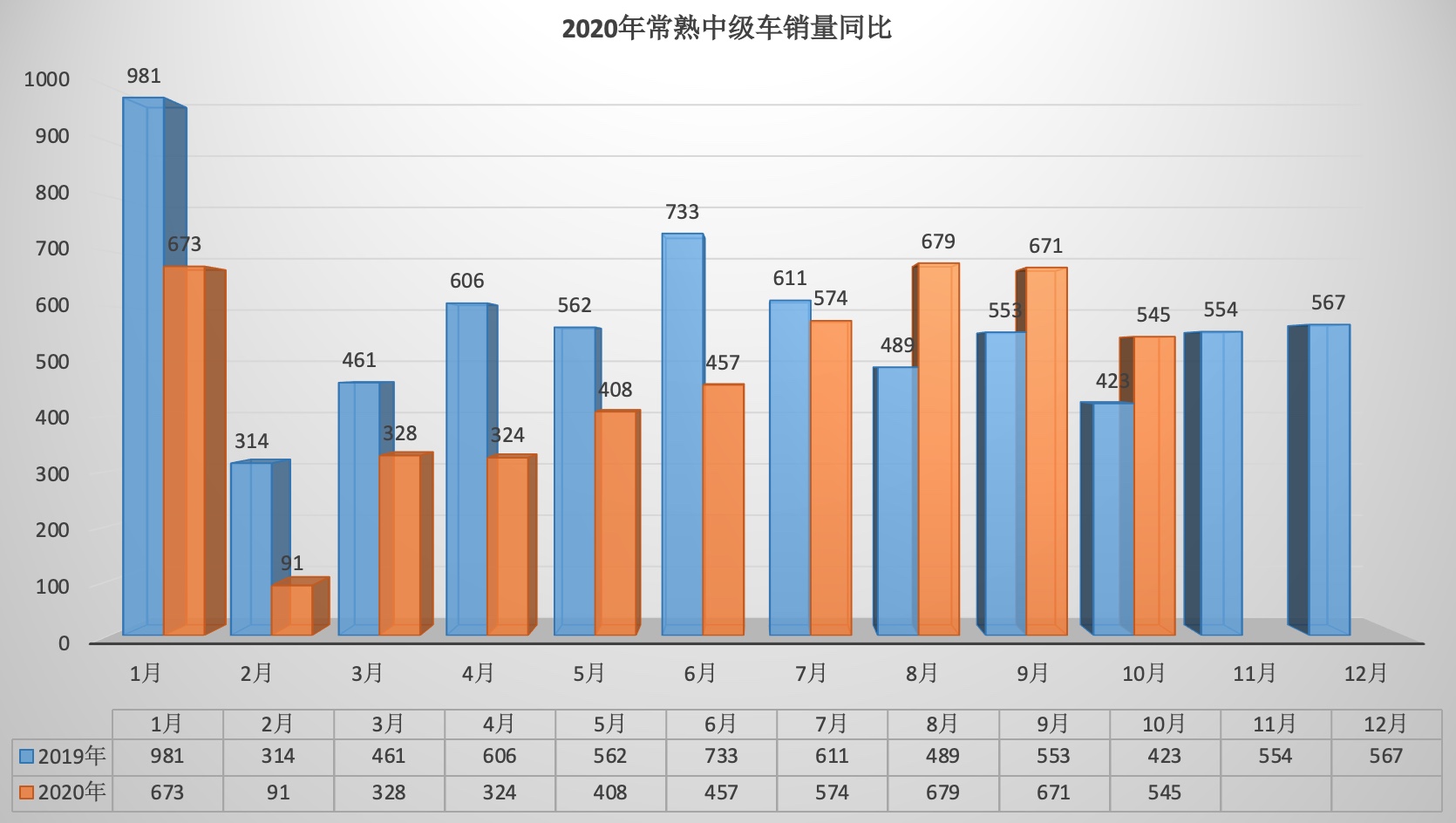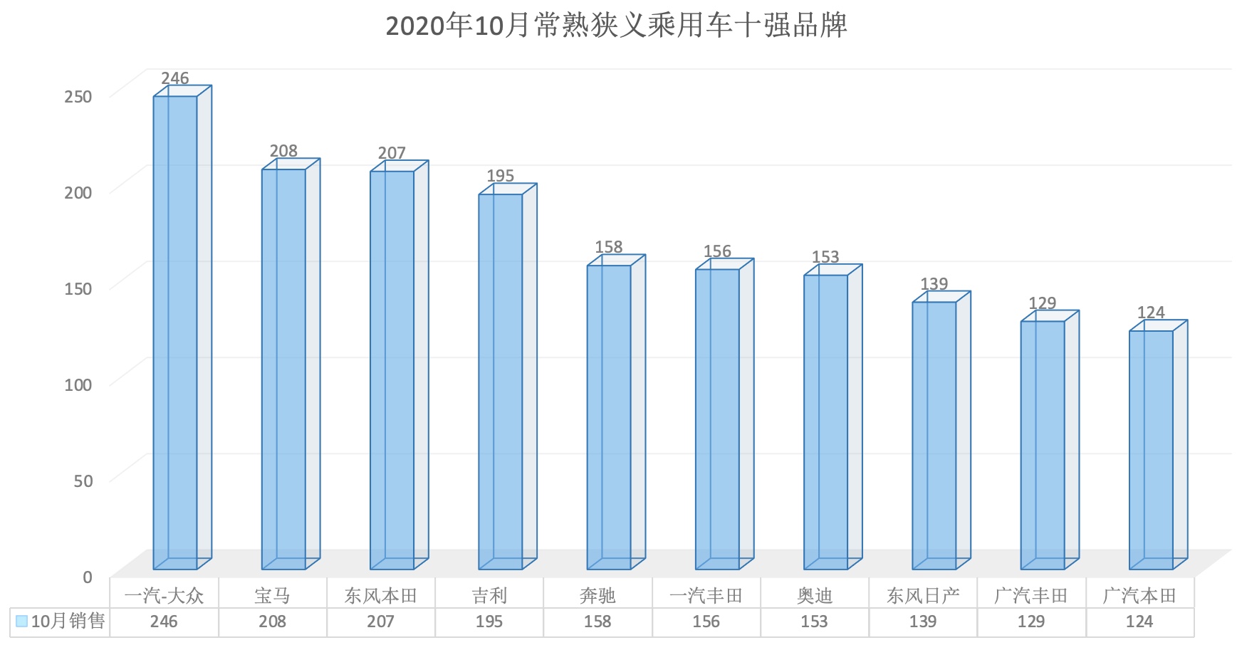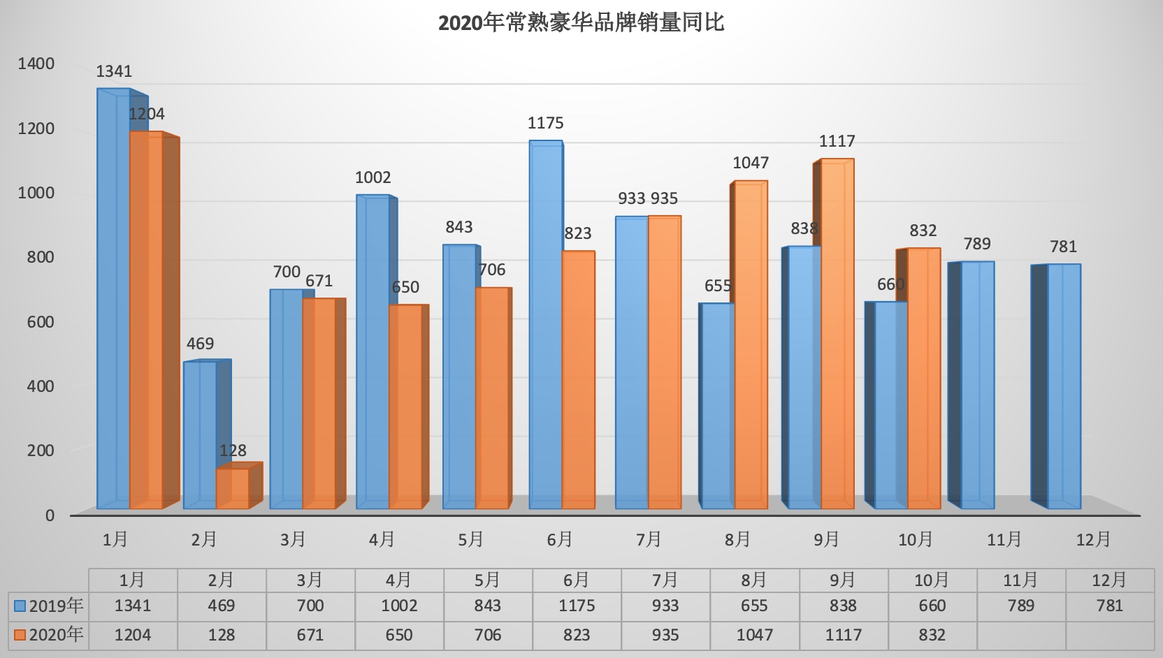 2020年10月常熟狭义乘用车销量3232台同比增长8.68%,环比下降14.07%。1-10月常熟狭义乘用车总销量29326台,同比下降13.26%。10月销量中自主品牌同比增长5.98%,美系品牌同比增长34.38%,韩系品牌同比下降23.15%,欧系车同比增长37.50%,德系同比增长1.20%,日系同比增长13.07%。
