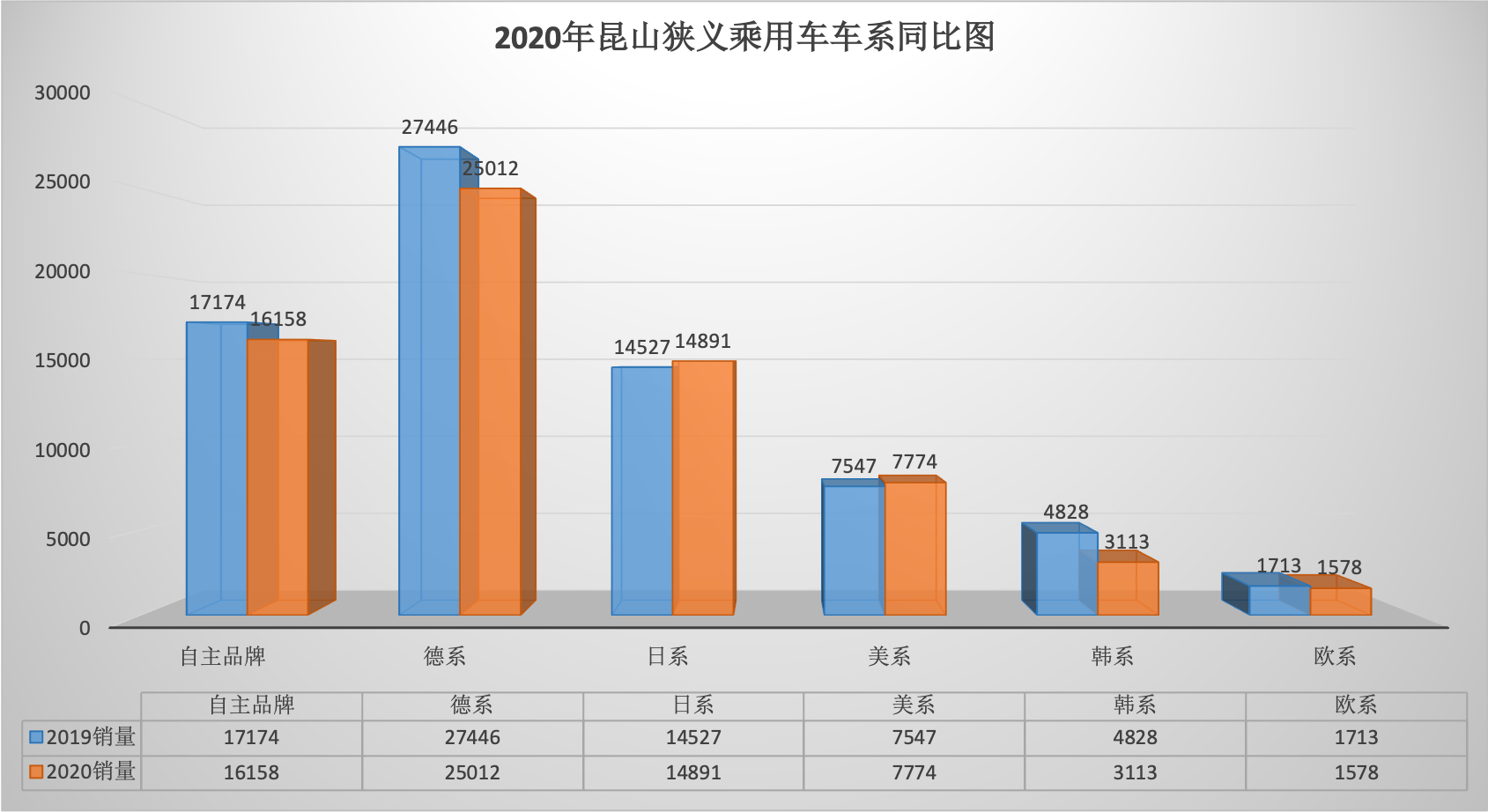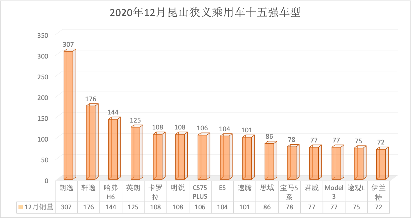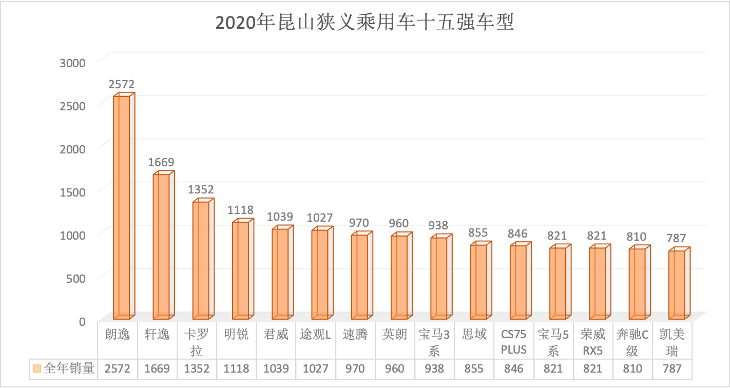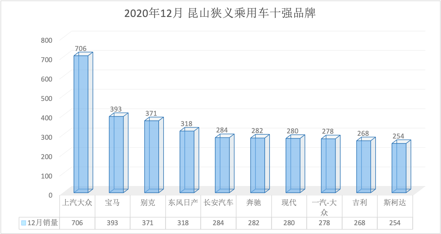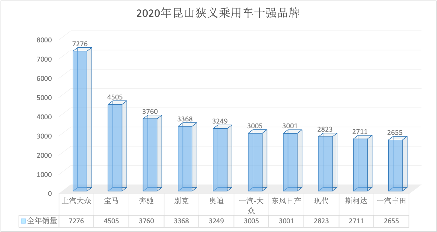 2020年全年昆山狭义乘用车总销量68569台同比下降6.34%。12月昆山狭义乘用车销量6888台,同比下降1.57%,环比增长7.07%。全年销量中自主品牌同比下降5.92%,美系品牌同比增长3.01%,韩系品牌同比下降35.52%,欧系车同比下降7.88%,德系同比下降8.87%,日系同比增长2.51%。