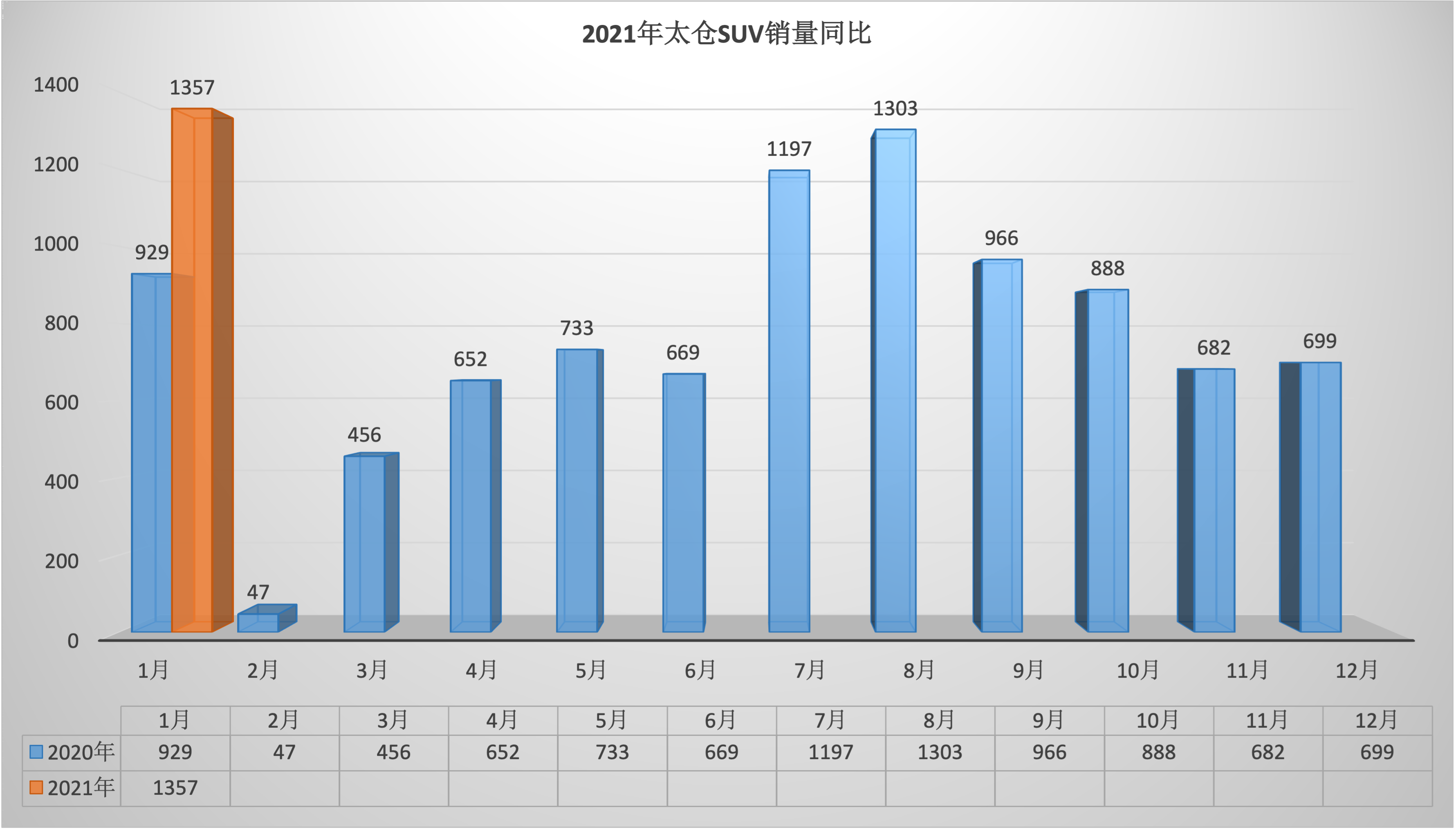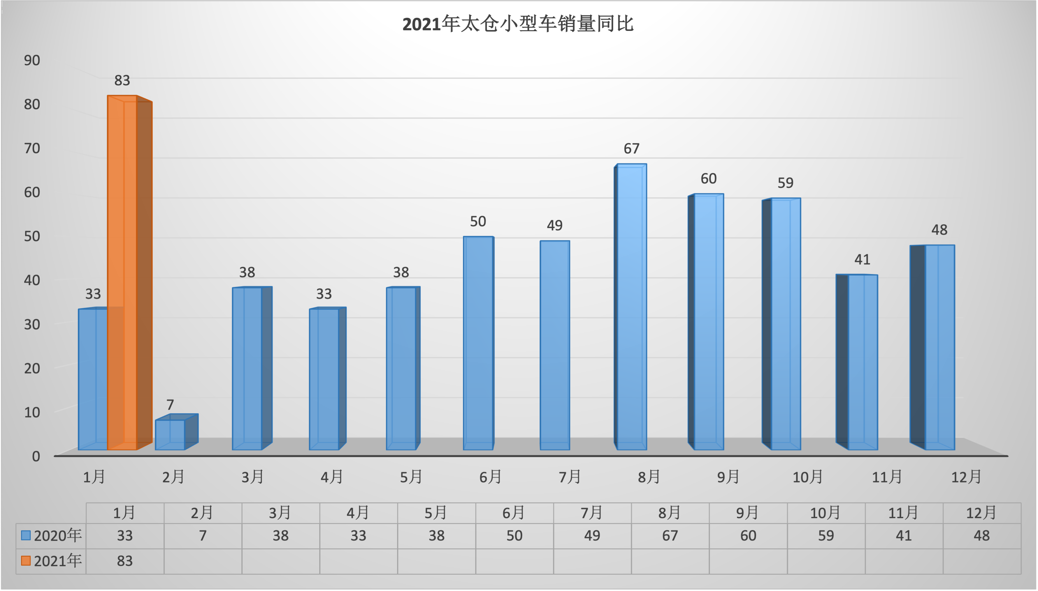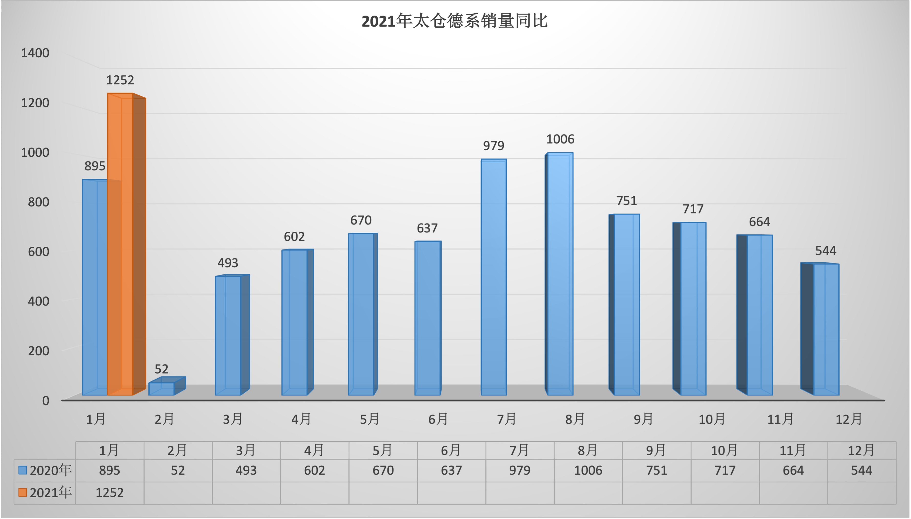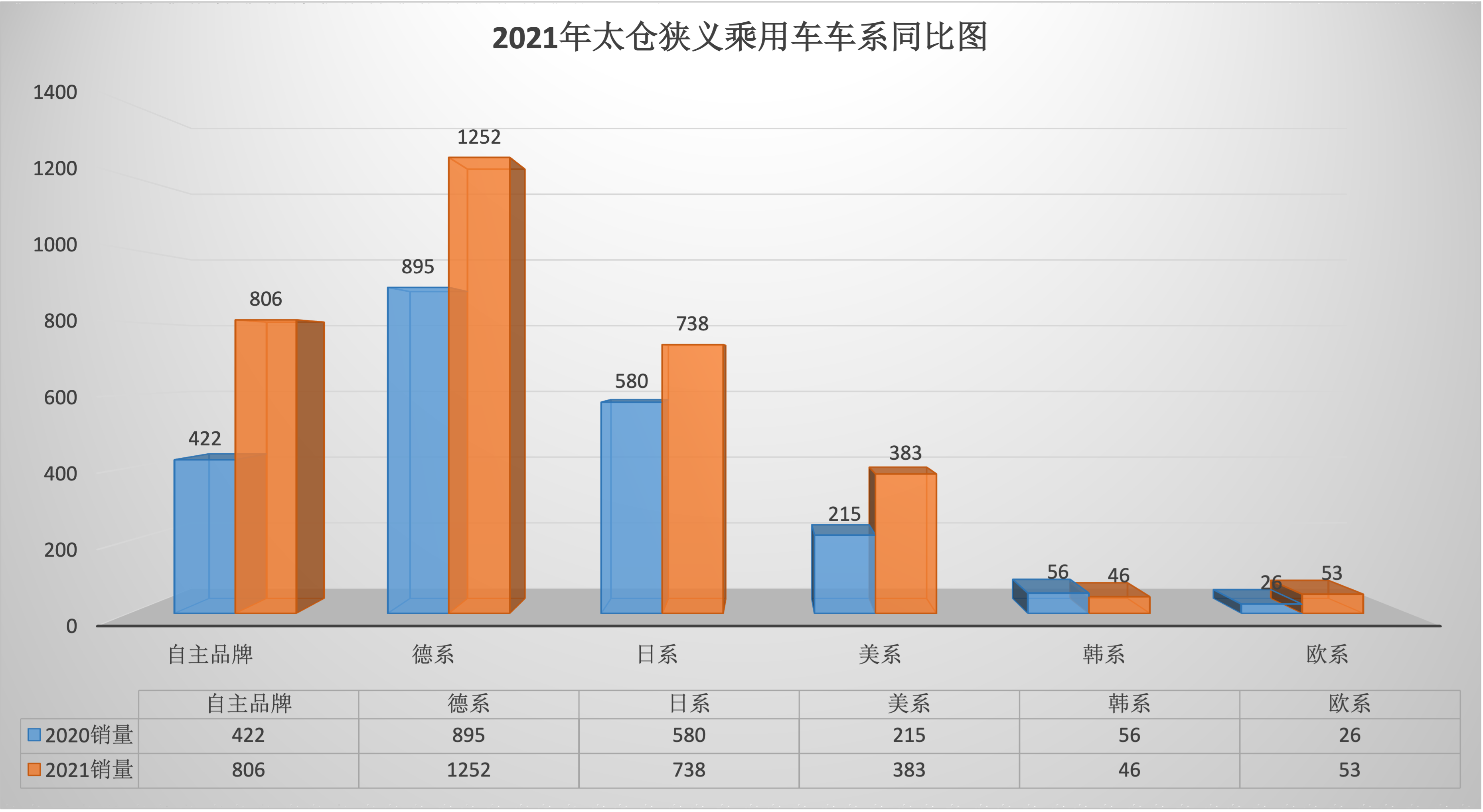 2021年1月太仓狭义乘用车销量3278台同比增长49.20%,环比增长78.54%。其中自主品牌同比增长91.00%,徳系品牌同比增长39.89%,日系品牌同比增长27.24%,美系车同比增长78.14%,韩系同比下降17.86%,欧系同比增长103.85%。