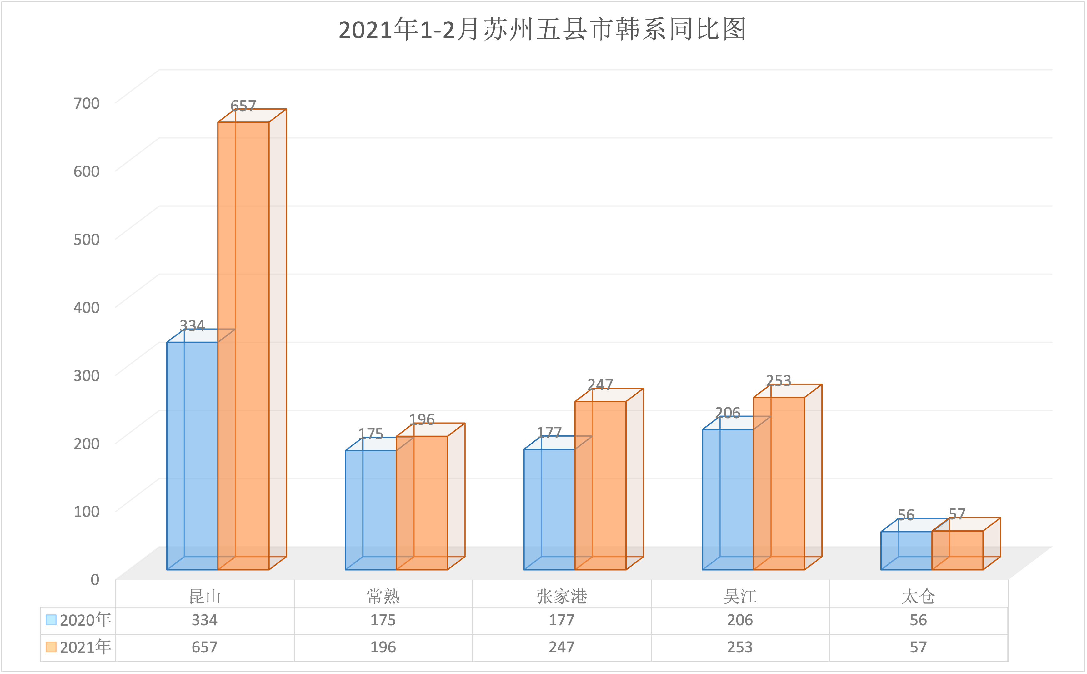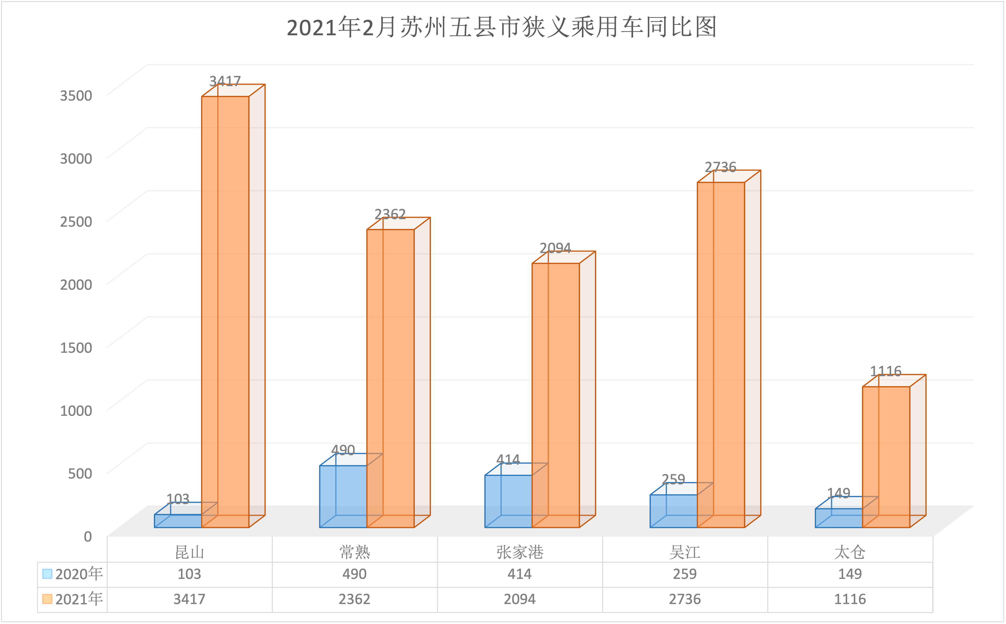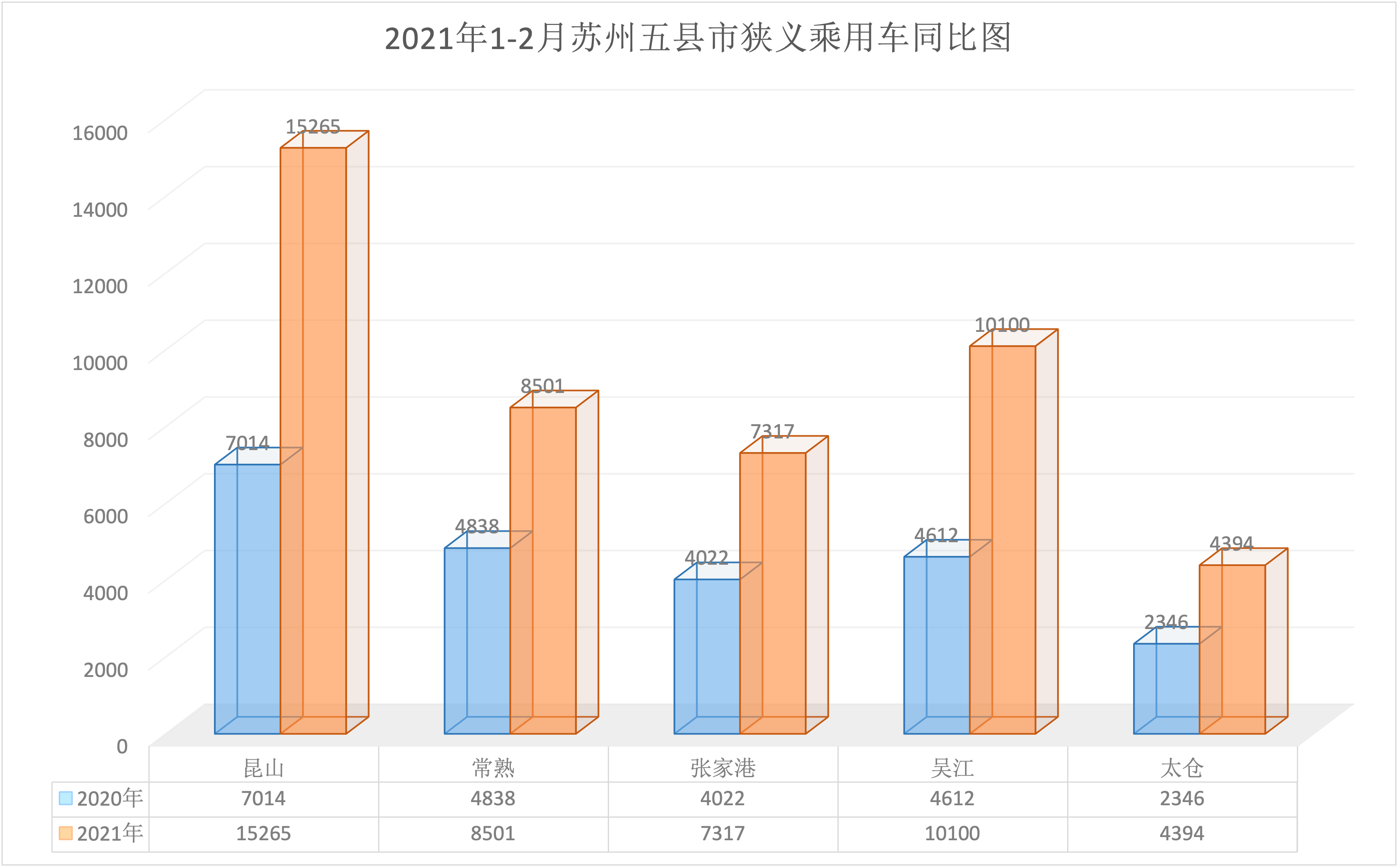 2021年1-2月苏州市所辖五县市狭义乘用车销量45577台同比增长99.62%,同时五县市占苏州大区从2020年同期的55.98%上升到了58.43%。