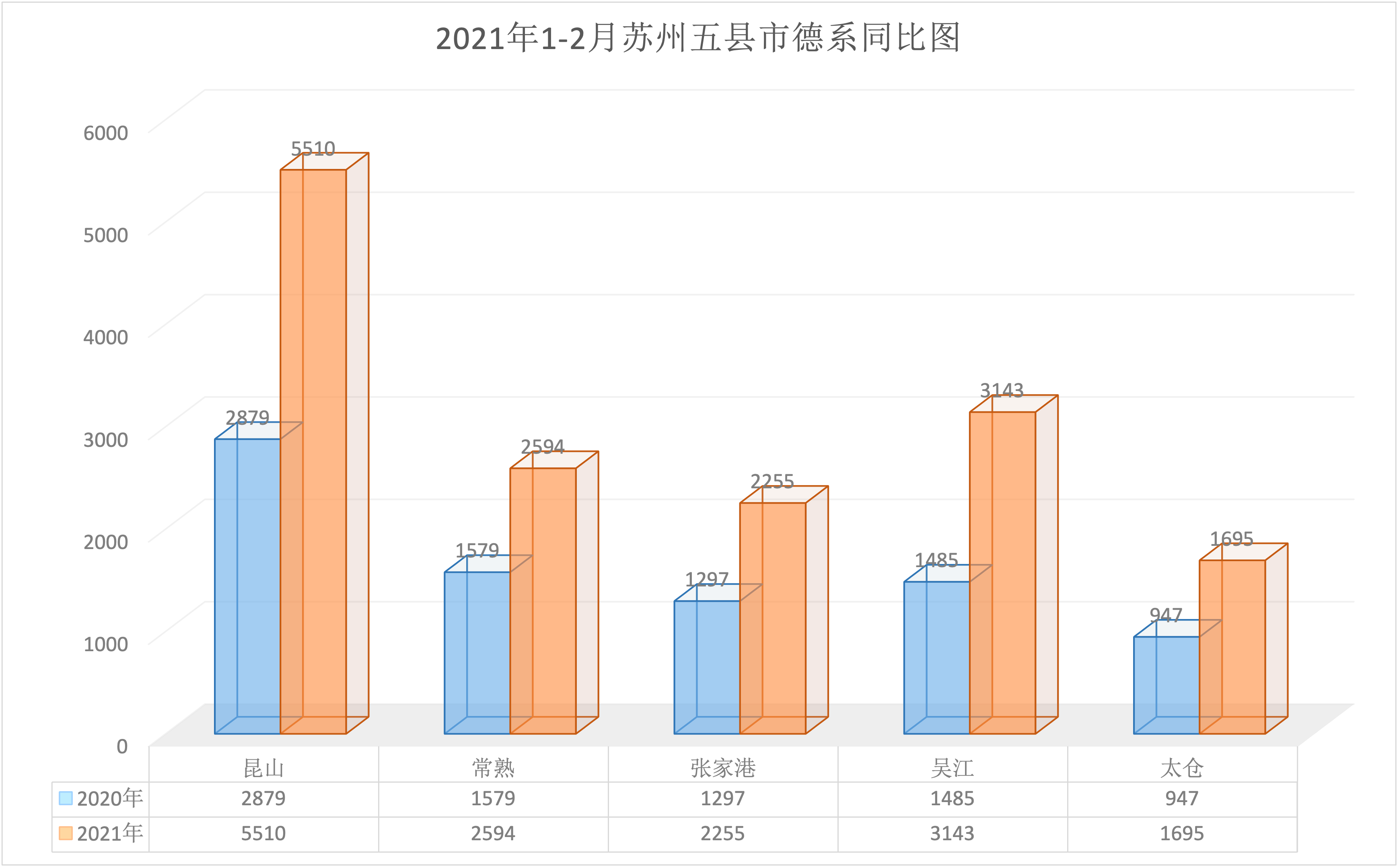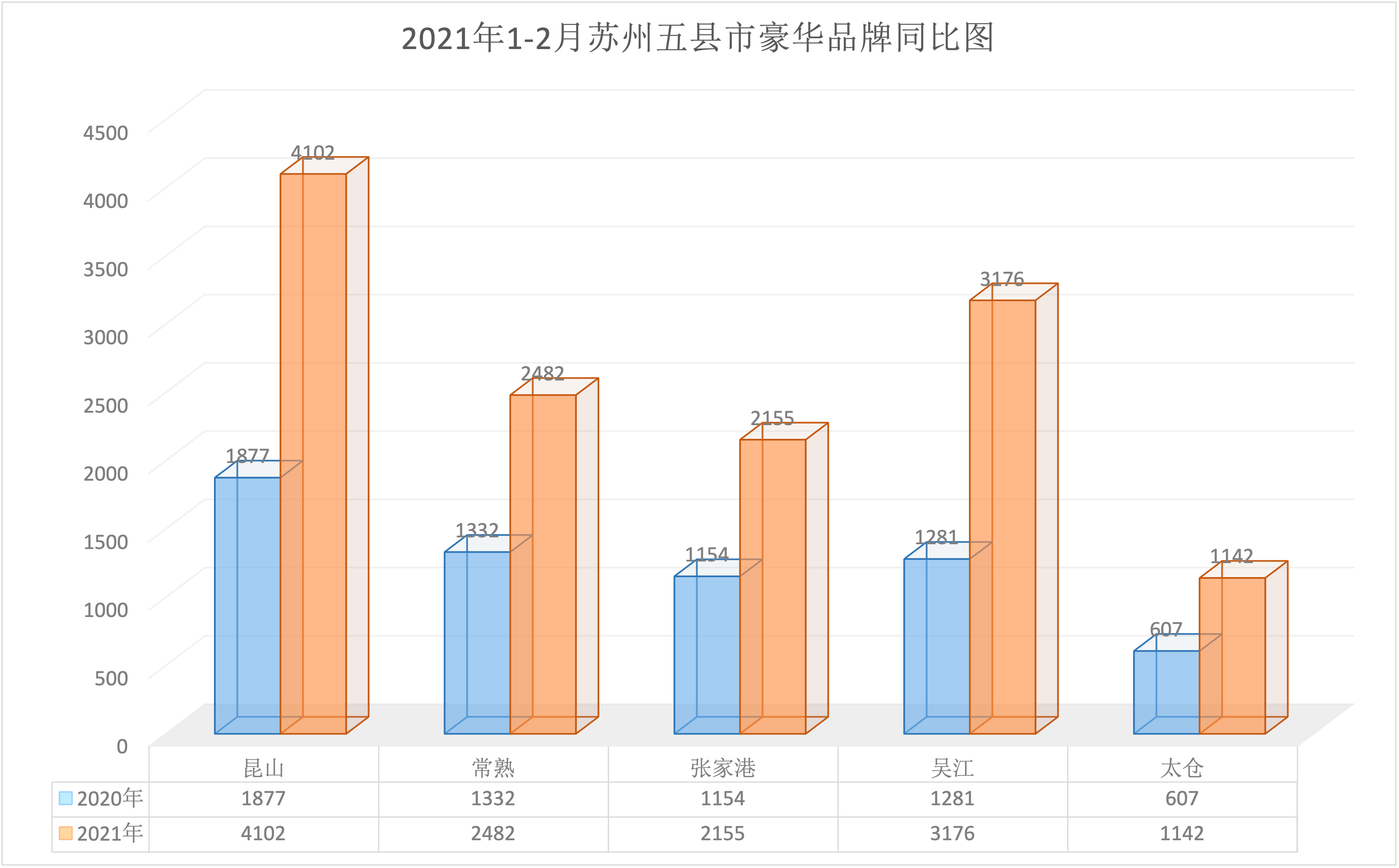 从几个重要指标来看:豪华品牌增速来看吴江以147.93%增速排名第一,其他:昆山118.54%的增速,常熟86.34%的增速,张家港86.74%,太仓88.14%。