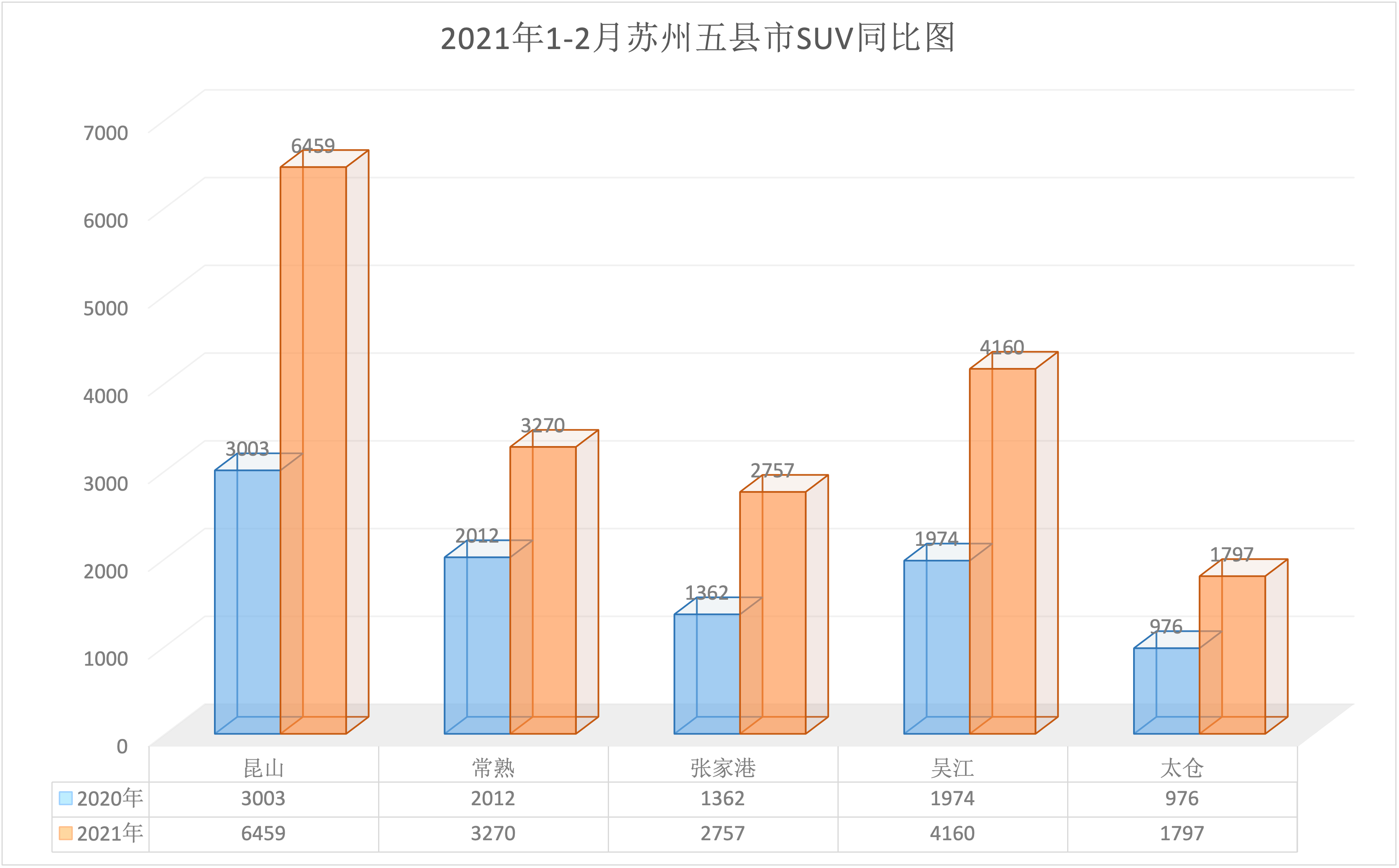 SUV昆山115.08%的增幅排第一,吴江110.74%,太仓84.12%,张家港102.42%,常熟62.52%。