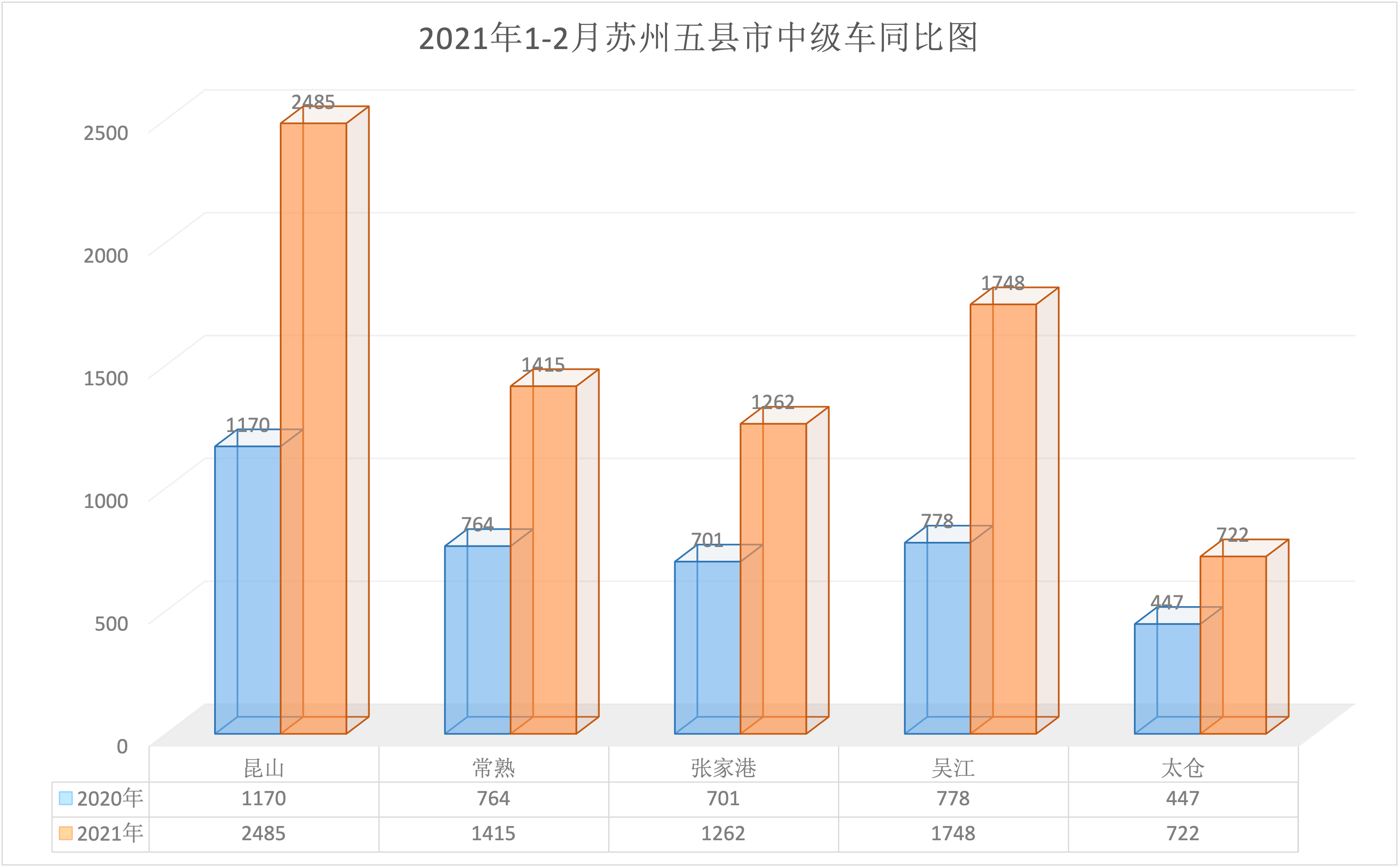 中级车市场吴江以124.68%的增速领头,昆山112.39%紧跟其后,常熟85.21%,张家港80.03%,太仓61.52%。