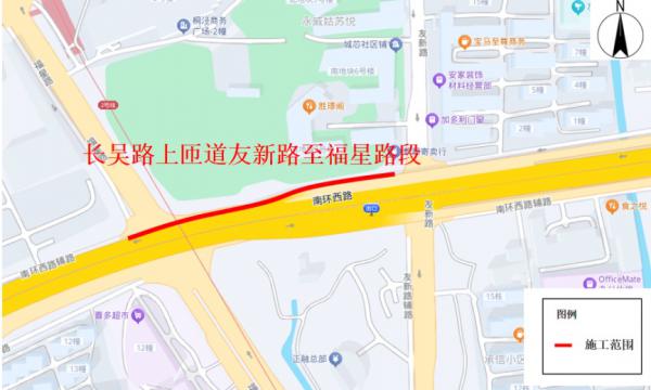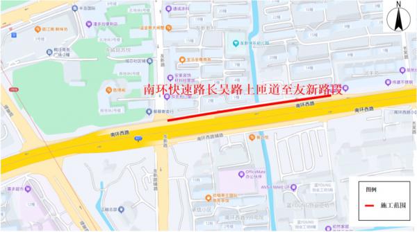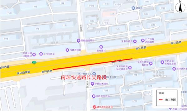 施工范围:南环快速路(长吴路上匝道至友新路段东向西最右侧车道),封闭长度约270米,过往车辆可通过剩余车道通行。