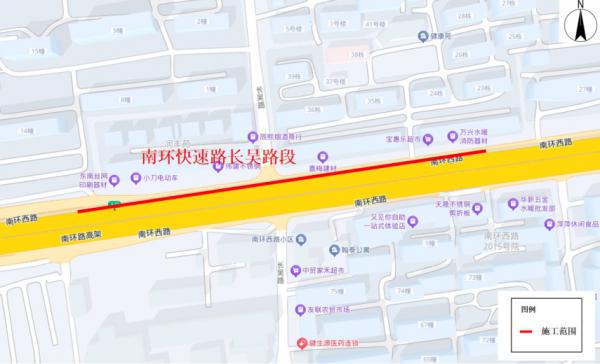 施工范围:南环快速路(长吴路上匝道友新路至福星路段东向西与主线并线段全幅车道),封闭长度约420米,过往车辆可通过左侧护栏开口进入南环快速路主线。