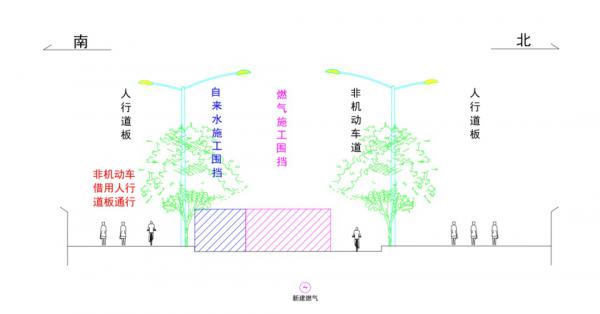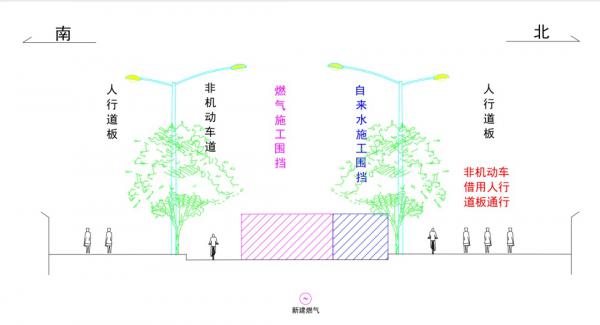 (1)一期夜间施工:施工段禁止机动车通行(其余未施工路段仅供内部车辆通行),南侧非机动车正常通行,北侧非机动车借人行道板通行,行人正常通行。