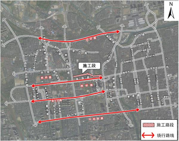 施工期间,过往机动车建议从干将西路、金门路、枫桥路、北环路等周边道路绕行。