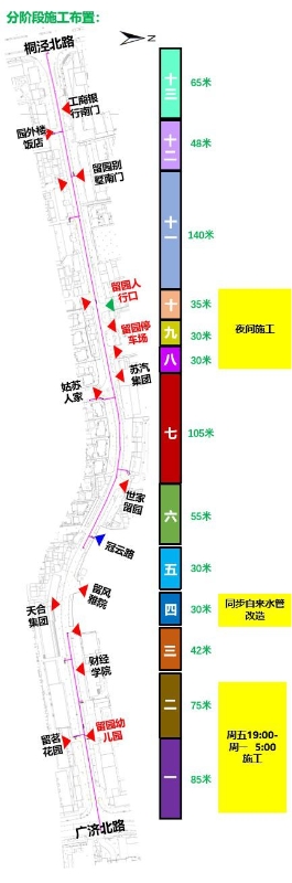 为最大限度降低施工对交通的影响,同步保障施工安全和交通安全,经公安交管部门会同苏州燃气集团、苏州市自来水有限公司及施工方等部门充分研究,决定对留园路(桐泾北路-广济路)自2025年11月28日至2026年1月25日采取分段封闭交通的临时管理措施,施工路段禁止机动车通行(其余未施工路段仅供内部机动车通行),非机动车、行人正常通行。为最大程度减少施工对沿线商户、居民的影响,留园路整体根据沿线出入口、路口精细化分为十三个阶段施工。同时优化施工工艺,最大限度压缩施工时间,减少对道路交通的影响。