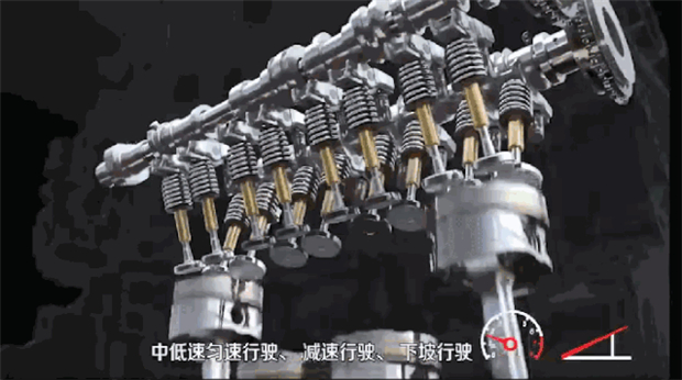 深踩油门进行急加速、高速匀速行驶时四缸澎湃模式使气门升程全开带来大扭矩和快速响应,充分保障澎湃的动力输出;中等油门进行中高速匀速行驶时,四缸高效模式使气门升程半开,在动力和能耗间取得高效平衡;小油门下,中低速匀速、减速行驶或下坡行驶时,两缸畅行模式保持两个气缸工作,获得极佳的燃油经济性。