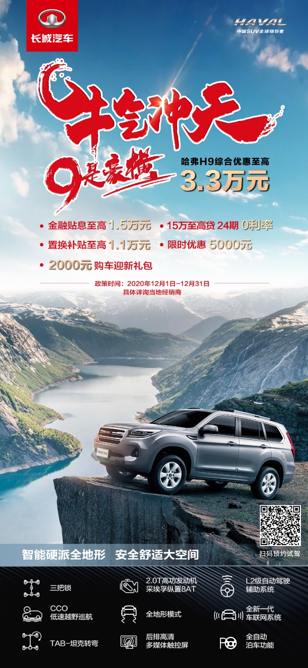 通过打造“狂野驾期”户外高品质生活体验活动,哈弗H9为消费者传递着最地道的越野文化的同时,也在帮助消费者构建属于自己的泛户外生态圈,让更多人走进越野,拥抱高品质户外生活。作为中国越野文化的新图腾,强势的市场销量也一再印证着哈弗H9在市场的领导地位,11月劲销3034台,同比大增49.6%,不断壮大的车友圈也在推动着越来越多的人群认可“越野+”的生活方式;近期公布的中国汽车保值率风云榜,哈弗H9蝉联2020年度紫檀奖,荣膺中国品牌中大型SUV保值率N0.1,这也从侧面说明,哈弗H9已经获得了越野玩家的认可。据悉,哈弗H9全国各城市经销店均已推出“牛气冲天,9是豪横”主题购车优惠福利,用户可享至高3.3 万元的综合优惠(包含“至高11000元的高额置换补贴、至高15000元的金融补贴以及限时优惠5000 元、2000 元迎新礼包等 ”)。哈弗H9以更硬核的诚意,助力广大车友走进越野世界。