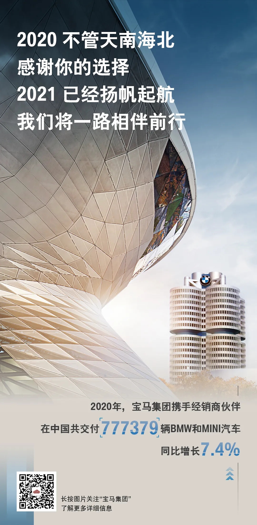 “ 2020年,中国举国上下同心同德,在抗击疫情和恢复经济两方面取得卓越成绩,危机面前表现出强大韧性。而宝马集团始终与中国同步向前,以全面措施加入抗疫行列,促进业务增长的同时加快数字化进程。在中国合作伙伴的大力支持下,宝马化危为机,致力于与中国共同打造美好未来。”