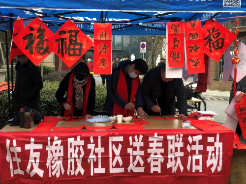 住友橡胶特别邀请了书法家前来社区挥毫泼墨,一幅幅写满祝福的春联跃然于红纸之上,一张张俊逸洒脱的“福”字满怀美好祝愿。尽管冬季的气温很低,也挡不住居民参与活动的热情。在各社区现场,排队领取春联的居民络绎不绝,每张脸上都洋溢着幸福的笑容。据统计今年共有350副春联送到了居民手中,让每家每户的大门口年味十足。