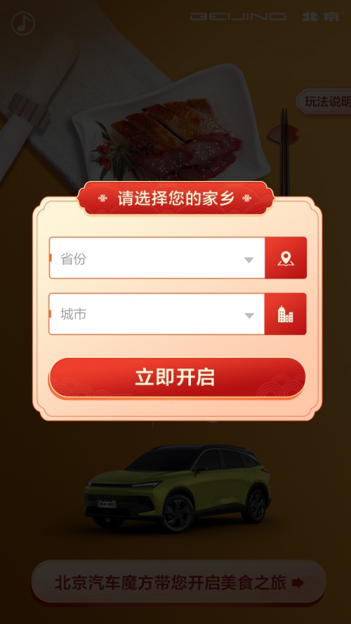 1月13日-2月7日,北京汽车带您开启美食之旅,在活动页面选择您的家乡,投票选出您心中的top家乡美食,即可有机会获得春节期间北京汽车全系车型使用权,同时,活动期间抖音平台拍摄上传最能代表家乡味道的视频,参与#为你的家乡菜打call#话题,将有机会瓜分10万现金礼。欢迎参与并分享北京汽车带来的温暖冬日感动。