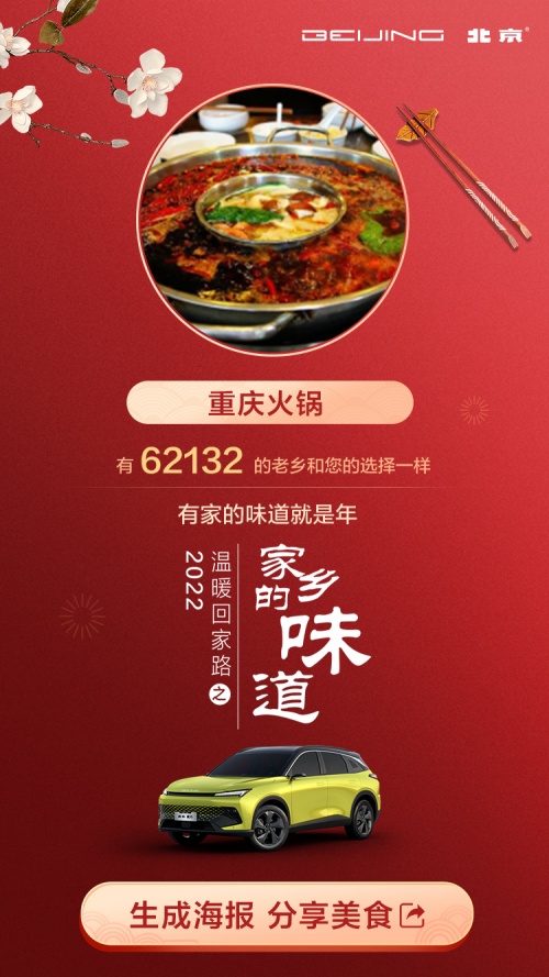 疫情之下的第三个春节即将到来,身处异地的游子,本应在回家的路上,除夕夜临近,你是否踏上归程?谁会是第一个给你祝福的人?此时此刻,北京汽车为异地过年的你呈上囊括“八大菜系”,34个省市自治区、直辖市新鲜出炉的各类饕餮美食,票选各地top家乡菜,愿送在京过年的你来自家乡的一声问候,一解乡愁。