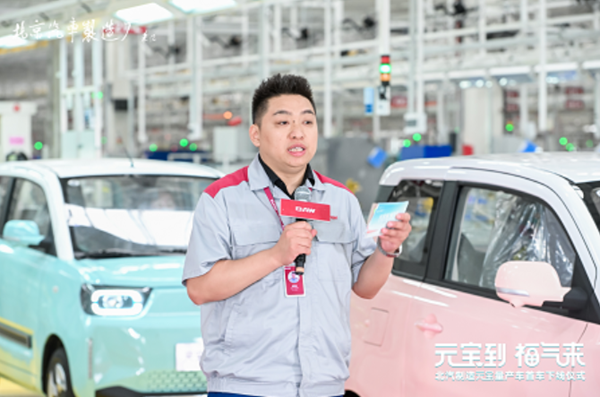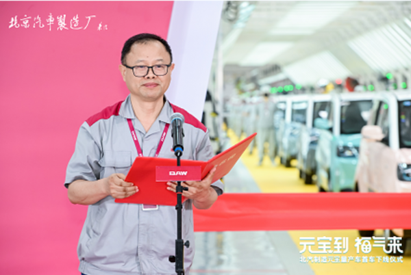 在元宝量产车首车下线仪式上,北京汽车制造厂总裁魏勇先生宣布命名词,他表示,经董事会授权,将全新平台的三门四座A00新能源车型命名为元宝。正式命名的确定,不仅承载着北汽制造对国民美好生活的向往,也标志着北京汽车制造厂新能源汽车的新航向。