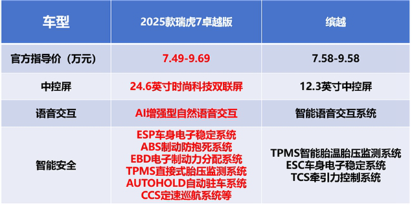与2025款瑞虎7卓越版相比,缤越在智能方面稍显“拮据”。搭载的12.3英寸中控屏,尺寸远远落后2025款瑞虎7卓越版。主动安全方面,其标配TPMS智能胎温胎压监测系统、ESC车身电子稳定系统、TCS牵引力控制系统等。显然,无论是智能交互,还是智能安全,2025款瑞虎7卓越版都更胜一筹,更符合年轻人对智能化的需求。