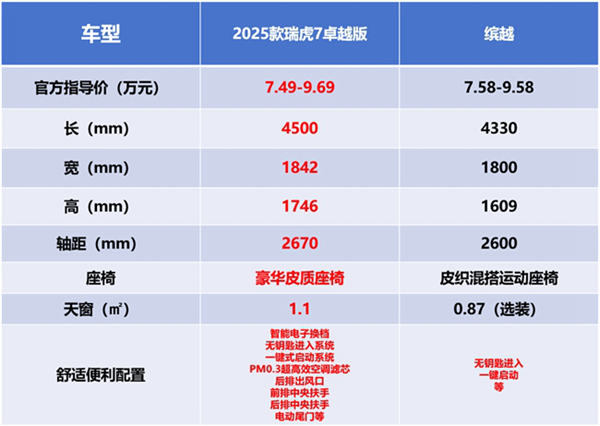 再看缤越,其长宽高4330×1800×1609mm,轴距2600mm,车身尺寸全方位落后于2025款瑞虎7卓越版,可想而知,车内空间自然也不如其那般宽绰。而在车内配置方面,缤越配备了皮织混搭运动座椅、无钥匙进入、一键启动等,电动天窗面积为0.87㎡,且只提供选装。显然,在车内空间与舒适性的打造上,2025款瑞虎7卓越版也更具诚意。