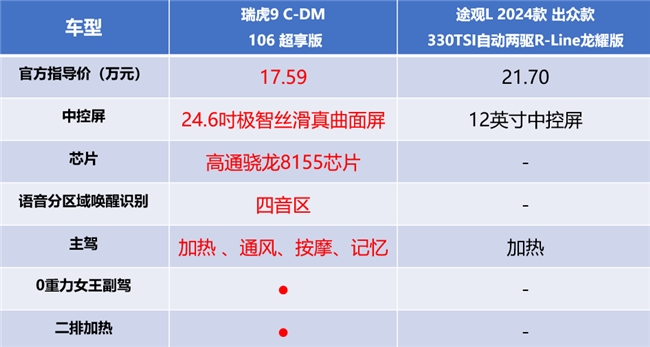同样是20万预算,途观L甚至连副驾都需要将就,而瑞虎9 C-DM在动力性能、空间布局、智能科技、舒适体验等多个维度均展现出领先优势。综合来看,选择已然明确。如果你对高品质出行有追求,不妨尽快将瑞虎9 C-DM带回家,与家人一同开启卓越的出行新体验吧。