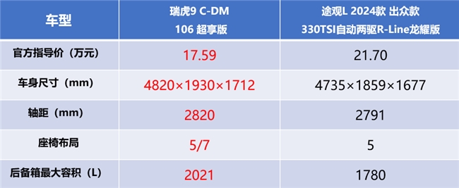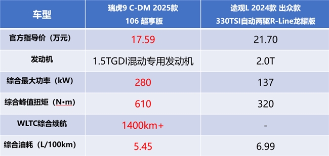 “不是XX买不起,而是XX更有性价比。”这句刷屏全网的热梗,其实说出了越来越多消费者的心声。套用在当今车市就是“不是合资燃油买不起,而是自主混动更具性价比”。在油价高居不下的情况下,通勤、出游等都不得不考虑出行车本,而在空间、舒适、智能等方面,自主混动都比合资燃油更具优势。比如,瑞虎9 C-DM就是非常不错的混动之选。今天,我们拿瑞虎9 C-DM 2025款106 超享版(下称瑞虎9 C-DM)与途观L 2024款 出众款330TSI自动两驱R-Line龙耀版(下称途观L)来一场全方位对比,看看在为年轻用户打造高品质出行体验上,自主混动究竟是如何从用户角度出发,狠狠拿捏住需求的?
