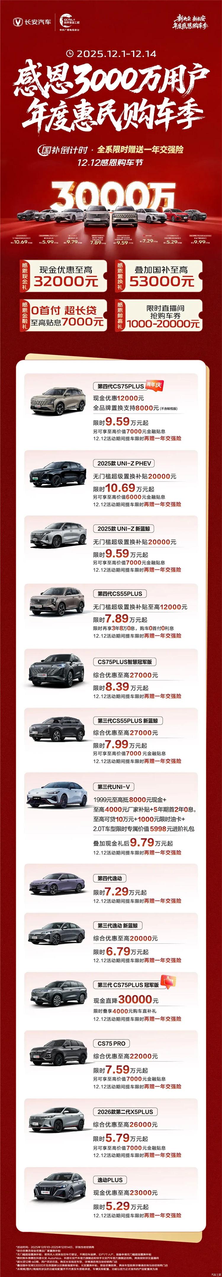 日前,长安汽车发布了最新的年末购车优惠政策,优惠政策涉及的车型包含长安CS75PLUS系列、UNI-Z PHEV系列、CS55PLUS、UNI-V、逸动系列、X5PLUS,不同车型有差异化的优惠金额,除现金优惠外厂家还提供赠送一年交强险权益,现金综合优惠最高可达32000元,活动时间由12月1日起至12月14日,详情如下。