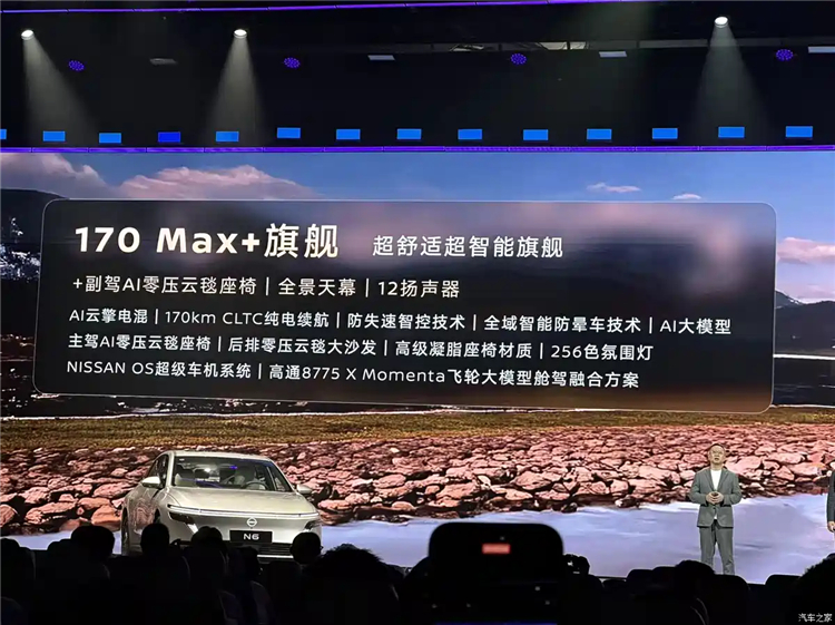 驾驶辅助方面,日产N6中低配车型配备5个摄像头和3个毫米波雷达,可以实现L2级驾驶辅助功能;顶配车型则会搭载7个摄像头、1个车内摄像头、12个超声波雷达和3个毫米波雷达,配合8775芯片+Momenta飞轮大模型,可实现高速领航辅助NOA、城市记忆领航辅助及全场景泊车辅助。