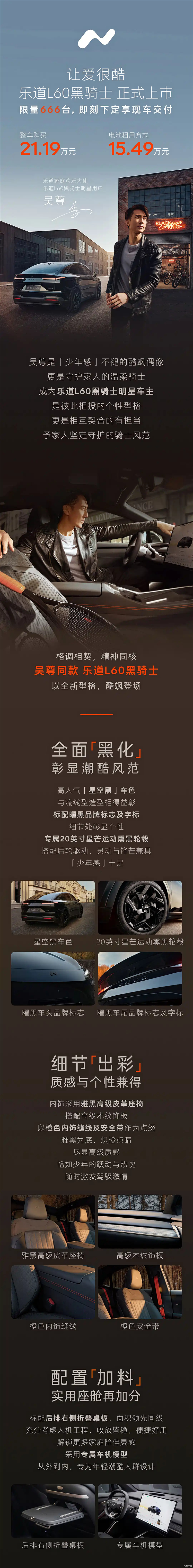 日前,乐道汽车官方发布了乐道L60黑骑士特别版上市的消息,新车采用定制化的纯黑外观与内饰设计,限量666台,并同步开启用户交付。乐道L60黑骑士整车售价21.19万元,采用BaaS电池租用方式购买,售价15.49万元。